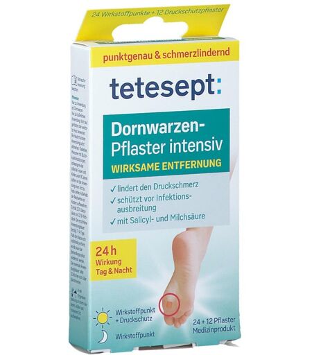 Anwendungsgebiet von Tetesept Dornwarzen-Pflaster IntensivTetesept Dornwarzen-Pflaster Intensiv eignen sich für eine punktgenaue Entfernung von schmerzenden Dornwarzen. Durch die hautschälende Wirkung von Salicyl- und Milchsäure wird die Warze von außen nach innen aufgelöst. Der Wirkstoffpunkt bietet so eine effektive und gezielte Heilung, ohne umliegende, gesunde Haut zu verletzen. Das Druckschutzpflaster schafft Druckentlastung und lindert so den Schmerz beim Gehen.Tetesept Dornwarzen-Pflaster Intensiv können in Ihrer Versandapotheke www.apotheke.at erworben werden. ...