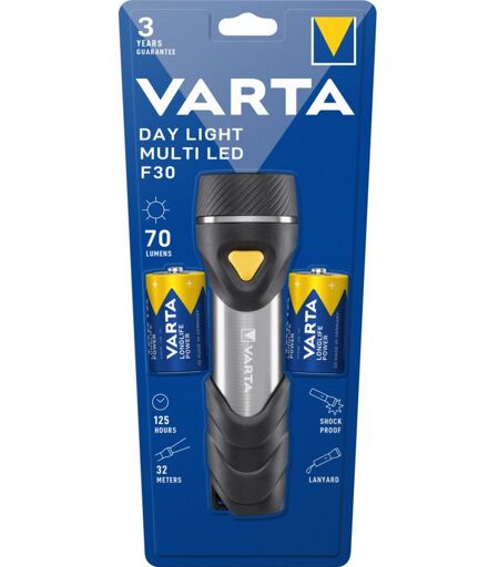 Die Day Light Multi LED F30 von Varta ist eine stabile Taschenlampe für den täglichen Gebrauch. Sie verfügt über ein stoßfestes, gummiertes Gehäuse und erzeugt mit 14 LEDs einen Lichtstrom von bis zu 70 Lumen. Und dies bis zu 125 Stunden lang: 2 D-Batterien sichern eine langlebige Stromversorgung. Die Handschlaufe sorgt außerdem für eine bequeme Handhabung. ...