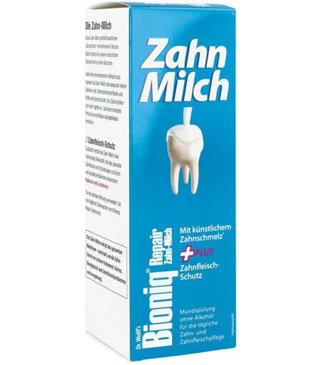 Anwendungsgebiet von Bioniq® Repair Zahn-MilchBioniq® Repair Zahn-Milch ist eine Mundspülung ohne Alkohol für die tägliche Zahn- und Zahnfleischpflege.Wirkungsweise von Bioniq® Repair Zahn-MilchDie Bioniq® Repair Zahn-Milch reinigt den gesamten Mundraum - auch an den Stellen, wo die Zahnbürste schwer hinkommt. Karies, Mundgeruch und Zahnfleischproblemen wird vorgebeugt. Die Zähne fühlen sich sofort glatter an, Bakterien und Verfärbungen lagern sich schlechter an. Die Zähne können dadurch weißer erscheinen.Wirkstoffe / Inhaltsstoffe / ZutatenInhaltsstoffe von Bioniq® Repair Zahn-Milch: