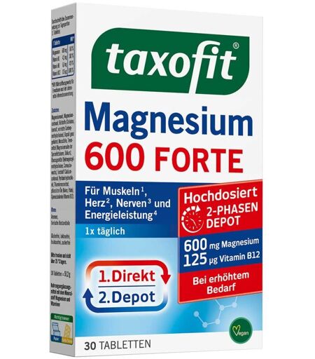 Anwendungsgebiet von Taxofit Magnesium 600 Forte Depot TablettenBesonders bei einem Lebensstil mit viel Engagement und Einsatz sollte der Körper gut versorgt sein: Taxofit Magnesium 600 Forte Depot Tabletten verfügt über besonders hochdosiertes Magnesium sowie die Vitamine B1, B6 und B12, damit der Körper bei sportlichen Aktivitäten und beruflichen Herausforderungen besonders unterstützt wird. Die Vitamine B1, B6 und B12 unterstützen genauso wie Magnesium eine normale Muskelfunktion. Außerdem tragen sie zu einem normalen Energiestoffwechsel und einem normalen Nervensystem bei.