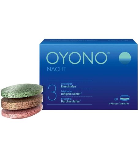 Anwendungsgebiet von Oyono Nacht TablettenDie innovative 3-Phasen-Tablette bei Schlafproblemen - Oyono Nacht TablettenGuter und erholsamer Schlaf ist wohltuend und wichtig für unsere Gesundheit. Die Auszeit vom Alltag ist notwendig für die Erholung von Körper und Seele, um frisch und ausgeruht den Alltag meistern zu können. Viele Menschen schlafen jedoch nicht immer so ungestört, wie sie es sich wünschen. Für einen erholsamen Schlaf kann das Nahrungsergänzungsmittel OYONO® Nacht mit der 3-Phasen-Tablette unterstützen - ohne Gewöhnungseffekt. Oyono Nacht Tabletten – 3 Phasen guter Schlaf• Unterstützt Einschlafen (1)• Trägt bei zu ruhigem Schlaf (2)• Begünstigt das Durchschlafen ohne Schlafunterbrechung (3)Die 3-Phasen-Tablette für ein Ziel - Ihren SchlafOyono Nacht Tabletten ist eine innovative 3-Phasen-Tablette mit ausgewählten pflanzlichen Inhaltsstoffen kombiniert mit dem körpereigenen Stoff Melatonin. Das Besondere an Oyono Nacht Tabletten ist, dass die enthaltenen Inhaltsstoffe nicht gleichzeitig, sondern zeitlich versetzt in 3 Phasen freigesetzt werden. Zuerst werden die Inhaltsstoffe der Sofort-Phase innerhalb von 10 Minuten, anschließend die der Chrono-Phase und zuletzt verzögert und langanhaltend bis zu 8 Stunden die Stoffe der Depot-Phase dem Körper zur Verfügung gestellt. Ausgewählte Inhaltsstoffe können das Einschlafen unterstützen (1), zu einem ruhigen Schlaf beitragen (2) und das Durchschlafen ohne Unterbrechung (3) begünstigen – ohne Gewöhnungseffekt.Damit Sie in der Nacht die Energie tanken können, die Sie am Tag brauchen.Mit der 3-Phasen-InnovationSofort-Phase:Die Sofort-Phase mit Melatonin, Baldrian Extrakt und Vitamin B6 löst sich innerhalb von 10 Minuten im Körper auf.Depot-Phase: Die Depot-Phase mit Melatonin und Passionsblumen-Extrakt löst sich langanhaltend, kontrolliert und verzögert auf - bis zu 8 Stunden. Chrono-Phase:Die Chrono-Phase mit Weißdorn-Extr ...