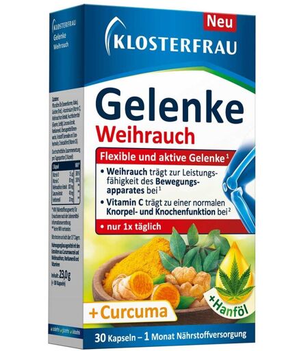 Anwendungsgebiet von Klosterfrau Gelenke Weihrauch WeichkapselnJeder Mensch wünscht sich Lebensqualität. Doch im Laufe der Zeit oder durch vermehrte körperliche Aktivität oder einseitige Belastungen werden die Gelenke stärker beansprucht. Deshalb ist die Erhaltung der Gesundheit von Ihren Gelenken äußerst wichtig. Klosterfrau Gelenke Weihrauch Weichkapseln verfügt über Weihrauch-Extrakt, das zur Leistungsfähigkeit des Bewegungsapparates beiträgt. Weihrauch unterstützt die Flexibilität der Gelenke zu erhalten. Das in Klosterfrau Gelenke Weihrauch Weichkapseln enthaltene Vitamin C trägt zu einer normalen Kollagenbildung und somit zu einer normalen Knorpel- und Knochenfunktion bei. Vitamin D unterstützt eine normale Muskelfunktion. Zusätzlich beinhaltet Klosterfrau Gelenke Weihrauch Weichkapseln Hanföl, das seit vielen Jahren zur inneren und äußerlichen Anwendung genutzt wird.Wirkstoffe / Inhaltsstoffe / ZutatenZutaten von Klosterfrau Gelenke Weihrauch Weichkapseln: Pflanzliche Öle (Sonnenblume, Kokos), Gelatine (Rind), L-Ascorbinsäure (Vitamin C), Weihrauchharz-Extrakt, Feuchthaltemittel (Glycerin, Sorbit), Curcuma-Extrakt, Hanfsamenöl, Überzugsmittel Bienenwachs, Farbstoff Eisenoxide und Eisenhydroxide, Cholecalciferol (Vitamin D3).