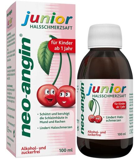Anwendungsgebiet von Neo Angin junior HalsschmerzsaftNeo Angin junior Halsschmerzsaft beruhigt die Schleimhaut des Nasen-Rachenraums und lindert Halsschmerzen. Besonders in der kalten Jahreszeit wird die Atemluft durch viele Krankheitserrerger belastet. Bei gereizter, ausgetrockneter und geschwächter Schleimhaut dringen Erreger wie Bakterien und Viren schneller ein und führen zu Halsschmerzen. Da Halstabletten erst für Kinder geeignet sind, die sicher lutschen können, eignet sich Neo Angin junior Halsschmerzsaft bereits bei Halsschmerzen für die Allerkleinsten und kann ab 1 Jahr angewendet werden.Wirkungsweise von Neo Angin junior HalsschmerzsaftDieser Halsschmerzsaft wurde speziell für Kleinkinder entwickelt, wenn die Gefahr besteht, dass Tabletten verschluckt werden. Nach kindgerechter Rezeptur ist der Saft zucker- und alkoholfrei und hat einen leckeren Kirsch-Geschmack. Extrakte aus Isländisch-Moos und Malvenblüten wirken schützend und beruhigend auf die Schleimhaut von Mund und Rachen. Durch die spezielle Rezeptur bleibt der Schutzfilm lange haften, damit die Kontaktzeit der Wirkstoffe mit der Schleimhaut verlängert wird. Somit werden Mund und Rachen vor weiteren Reizungen geschützt und können sich schneller regenerieren.Wirkstoffe / Inhaltsstoffe / ZutatenZutaten von Neo Angin junior Halsschmerzsaft:
