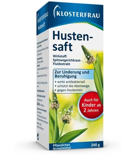 Anwendungsgebiet von Klosterfrau HustensaftKlosterfrau Hustensaft ist ein pflanzliches Arzneimittel bei Erkältungskrankheiten der Atemwege und dient zur Linderung von Hustenreiz.Wirkungsweise von Klosterfrau HustensaftDer in Klosterfrau Hustensaft enthaltene Spitzwegerich legt eine Art Schutzfilm über die gereizte Schleimhaut und schützt sie so vor zusätzlichen Reizen durch äußere Einflüsse, ohne dass das Abhusten wesentlich behindert wird. Es wirkt dabei antibakteriell. Klosterfrau Hustensaft kann bereits bei Kindern ab 2 Jahren angewendet werden.Wirkstoffe / Inhaltsstoffe / ZutatenKlosterfrau Hustensaft enthält: