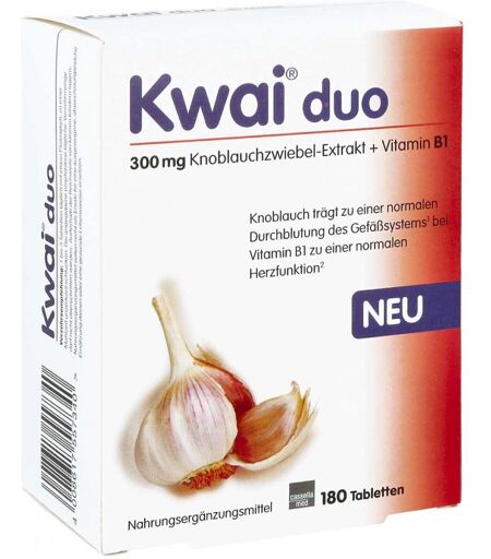 neben dem Knoblauchzwiebel-Extrakt auch Vitamin B1 und kann einen ernährungsphysiologischen Beitrag für eine gute Durchblutung des Gefäßsystems leisten und zur normalen Herzfunktion sowie einem normalen Cholesterinspiegel beitragen. Knoblauch ist weitverbreitet und wird als Universalgewürz eingesetzt. Daneben unterstützt es das gesamte Herz-Kreislauf-System. Außerdem trägt Knoblauch zu einem normalen Cholesterinspiegel bei. Das zusätzlich in Kwai Duo Tabletten enthaltene Vitamin B1 trägt zu einer normalen Herzfunktion bei.
