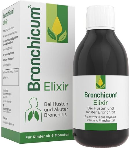 Anwendungsgebiet von Bronchicum ElixirBronchicum Elixir von Klosterfrau ein pflanzliches Arzneimittel, dass gegen Beschwerden bzw. Erkrankungen der Atemwege hilft. Während einer Erkältung hilft Bronchicum Elixir optimal Symptome einer akuten Bronchitis und Erkältungskrankheiten der Atemwege mit zähflüssigem Schleim zu lindern. Das wohlschmeckende Bronchicum Elixir enthält eine ausgewählte Rezeptur aus Ölen des Thymians und Wirkstoffen aus der Arznei-Primel. Wirkungsweise von Bronchicum ElixirBronchicum Elixir kann den festsitzenden Schleim lösen. Da Bronchicum Elixir ein Abhusten unterstützt, wird auch der Hustenreiz gebessert. Bronchicum Elixir wirkt außerdem gegen Entzündungen der Bronchien. Zudem wirken die natürlichen Bestandteile der Rezeptur auch gegen Bakterien, die für die Ursache der Erkrankung mitverantwortlich sein können.Wirkstoffe / Inhaltsstoffe / ZutatenBronchicum Elixir enthält: