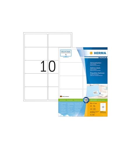 Nach Ihren Wünschen universell einsetzbar – die 1.000 HERMA Etiketten 4268 weiß 99,1 x 57,0 mmDie 1.000 HERMA Etiketten 4268 weiß 99,1 x 57,0 mm sind ein unverzichtbares Element in der Welt der Produktkennzeichnung und Organisation.Verfügt über eine matte OberflächeHier entscheiden Sie sich für einen Artikel aus Papier. Die matte Oberfläche ist ideal, um Informationen klar und gut lesbar zu präsentieren, ohne störende Lichtreflexionen. Das Aufkleben stellt kein Problem dar, hierfür sind die 1.000 HERMA Etiketten 4268 weiß 99,1 x 57,0 mm nämlich selbstklebend.Einfaches und schnelles Drucken dank praktischer AnordnungDamit Sie flexibel in der Anwendung sind und jederzeit ein passendes Exemplar zur Verfügung haben, sind die 1.000 HERMA Etiketten 4268 weiß 99,1 x 57,0 mm bedruckbar. Hierfür können Sie folgende Geräte: Kopierer, SW-Laser, InkJet nutzen. Angeordnet sind die Exemplare auf einem A4-Bogen.Einfacher Druck von PortoEine tolle Möglichkeit ist auch der Druck von Internetmarken. Einfach und unkompliziert Ihr gewünschtes Porto ausdrucken und aufkleben.1000 Etiketten in den Maßen 99,1 x 57,0 mm (BxH)Eine Packung beinhaltet insgesamt 1000 Etiketten in den Maßen 99,1 x 57,0 mm (BxH). Verteilt sind sie auf 10 Stück je Blatt.Verfügt über einen Rand rundumDas Design muss genauso passen wie die Funktionalität: Benötigen Sie Gestaltungsspielraum und eine Kennzeichnung, die einen professionellen und neutralen Eindruck hinterlässt? Dann sollten Sie sich für eine weiße Etikettierung wie diese hier entscheiden. Die Umrandung dient nicht nur der Ästhetik, sondern auch der leichteren Positionierung auf Verpackungen und Dokumenten.Welche Umweltkriterien wurden bei der Herstellung berücksichtigt?Die Entscheidung für ein Produkt wie dieses, das eine Zertifizierung besitzt, bietet Ihnen als Verbraucher die Möglichkeit, einen verantwortungsvollen Umgang mit Ressourcen zu unterstützen. Sie erhalten ein Produkt mit folgendem Zertifikat: FSC®: Dieses FSC®-zertifizierte Produkt enthält ausschließlich FSC®-zertifizierte und andere kontrollierte Materialien.Die beste Etikettenlösung für Ihre Produkte!Sie können die 1.000 HERMA Etiketten 4268 weiß 99,1 x 57,0 mm bequem in unserem Online-Shop bestellen.Etiketten online kostenlos gestalten, dazu hier Herma EtikettenAssistent öffnen ...