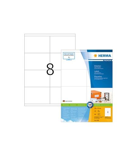 Erstellen Sie Ihre Etiketten einfach selbst – mit den 800 HERMA Etiketten 4426 weiß 105,0 x 70,0 mmHier erfahren Sie mehr zu den 800 HERMA Etiketten 4426 weiß 105,0 x 70,0 mm:Farbe: WeißMenge: 800 EtikettenBedruckbarExemplare in WeißMachen Sie den Design-Check: Die Farbe der Exemplare ist weiß. Daher haben Sie viel Gestaltungsspielraum bei Ihren Kennzeichnungen. Das neutrale Erscheinungsbild eignet sich für die unterschiedlichsten Einsatzzwecke. Ein Rand umrahmt Ihre Informationen auf elegante Weise und verleiht ein klassisches Erscheinungsbild.Anzahl und Format der 800 HERMA Etiketten 4426 weiß 105,0 x 70,0 mmDamit Sie sich so schnell nicht Gedanken über Nachschub machen müssen, erhalten Sie in dieser Packung 800 Etiketten, auf jedem Blatt 8 Stück. Natürlich ein wichtiges Kriterium beim Kauf dieses Produkts, das Format: Die Maße liegen bei 105,0 x 70,0 mm (BxH).Angeordnet auf A4-BogenDie 800 HERMA Etiketten 4426 weiß 105,0 x 70,0 mm eignen sich optimal zum Bedrucken, nutzen können Sie hierfür folgende Geräte: Kopierer, SW-Laser, InkJet. Die Exemplare sind auf einem A4-Bogen angeordnet.Einfacher Druck von PortoEine tolle Möglichkeit ist auch der Druck von Internetmarken. Einfach und unkompliziert Ihr gewünschtes Porto ausdrucken und aufkleben.Ein selbstklebender ArtikelHier entscheiden Sie sich für ein Produkt aus Papier. Dank der matten Oberfläche ist dieser Artikel reflektionsarm und unempfindlich gegenüber Fingerabdrücken. Das Aufkleben funktioniert ganz unkompliziert, die 800 HERMA Etiketten 4426 weiß 105,0 x 70,0 mm sind nämlich selbstklebend.Ein zertifiziertes ProduktDieses Produkt besitzt aufgrund seines vorbildlichen Herstellungsprozesses, bei dem auf einen verantwortungsvollen Umgang mit Ressourcen geachtet wurde, folgendes Zertifikat: FSC®: Dieses FSC®-zertifizierte Produkt enthält ausschließlich Materialien aus vorbildlich bewirtschafteten Wäldern und anderen kontrollierten Quellen. Der FSC® setzt sich weltweit für die Förderung guter Forstwirtschaft ein.Die beste Etikettenlösung für Ihre Produkte!Die 800 HERMA Etiketten 4426 weiß 105,0 x 70,0 mm können Sie unkompliziert hier in unserem Online-Shop bestellen!Etiketten online kostenlos gestalten, dazu hier Herma EtikettenAssistent öffnen ...