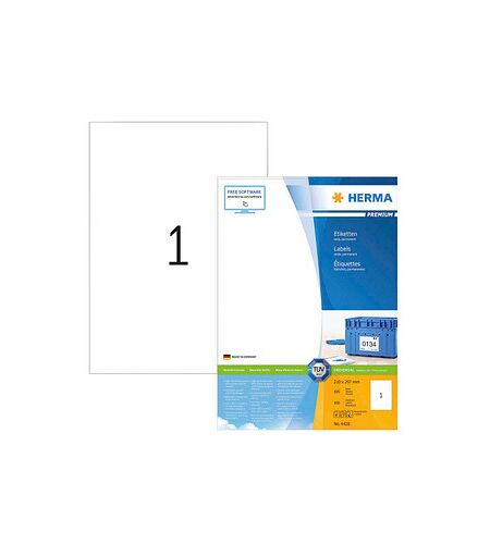 Erstellen Sie Ihre Etiketten einfach selbst – mit den 100 HERMA Etiketten 4428 weiß 210,0 x 297,0 mmDie 100 HERMA Etiketten 4428 weiß 210,0 x 297,0 mm sind die perfekte Lösung für Ihre Etikettierung!Zum Bedrucken geeignetBesonders praktisch sind Exemplare, die Sie einfach selbst bedrucken können. Das macht die Nutzung flexibel, unkompliziert und noch vielseitiger. Benutzen Sie für den Druck folgende Geräte: Kopierer, SW-Laser, InkJet. Angeordnet sind die Exemplare auf einem A4-Bogen.Exemplare in WeißDas Design muss genauso passen wie die Funktionalität: Das klassische Design in Weiß eignet sich für viele verschiedene Verwendungszwecke. Hierdurch sind Sie völlig frei in der Gestaltung und können die Kennzeichnung ganz nach Ihren Bedürfnissen vornehmen.Selbstklebend – abziehen und wieder aufklebenHier erhalten Sie ein Produkt aus Papier. Hier erhalten Sie ein mattes Produkt. Hierdurch spiegelt die Etikettierung nicht und ist unempfindlicher gegenüber unschönen Fingerabdrücken. Ausgestattet mit einer Abziehhilfe wird Ihnen das Leben hier erleichtert. Abziehen und aufkleben – so einfach ist es!Geprüft und für gut befunden!Ein vorbildlicher Umgang mit Ressourcen im Rahmen der Produktherstellung ist der maßgebliche Faktor für folgende Zertifizierung: FSC®: Mit dem Kauf dieses FSC®-zertifizierten Produkts tragen Sie dazu bei, die Wälder dieser Welt zu bewahren. Der FSC® hilft Wälder zu erhalten und schützt die Interessen der Menschen und Tiere, die in bzw. von diesen Wäldern leben.Wie viele Exemplare erhalten Sie?Hier können Sie Ihren Vorrat wieder auffüllen, denn Sie erhalten insgesamt 100 Etiketten, welche auf 1 Stück je Blatt verteilt sind. Die Maße liegen bei 210,0 x 297,0 mm (BxH). Dies entspricht einem A4-Format.Die beste Etikettenlösung für Ihre Produkte!Bestellen Sie die 100 HERMA Etiketten 4428 weiß 210,0 x 297,0 mm hier bei uns online!Etiketten online kostenlos gestalten, dazu hier Herma EtikettenAssistent öffnen ...