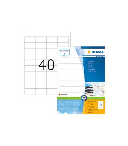 Die 4.000 HERMA Etiketten 4474 weiß 48,5 x 25,4 mm sorgen für eine ordentliche Ablage Ihrer DokumenteEgal ob es sich um die Beschriftung mit Text, Logos oder Barcodes von beispielsweise Ordnern, Umschlägen, Kartons, Namensschildern, Preisschildern, Reagenzgläsern, Lagerplätzen oder Regalen handelt - mit den 4.000 HERMA Etiketten 4474 weiß 48,5 x 25,4 mm erzeugen Sie eine hochwertige Etikettierung für eine saubere und ordentliche Beschriftung!Selbstklebend – abziehen und wieder aufklebenHier entscheiden Sie sich für einen Artikel aus Papier. Dank der matten Oberfläche spiegelt das Licht nicht wider und die Empfindlichkeit gegenüber Fingerabdrücken ist geringer. Die 4.000 HERMA Etiketten 4474 weiß 48,5 x 25,4 mm sind selbstklebend. Sie müssen sie also nur abziehen und aufkleben.Praktische Anordnung zum BedruckenDie 4.000 HERMA Etiketten 4474 weiß 48,5 x 25,4 mm lassen sich mit Kopierer, SW-Laser, InkJet bedrucken. Die Anordnung auf einem A4-Bogen ermöglicht ein schnelles und einfaches Bedrucken.Sie erhalten 4000 EtikettenVerteilt auf 40 Stück je Blatt erhalten Sie insgesamt 4000 Etiketten. 48,5 x 25,4 mm (BxH) betragen die Maße.Exemplare in WeißDas Design muss genauso passen wie die Funktionalität: Benötigen Sie Gestaltungsspielraum und eine Kennzeichnung, die einen professionellen und neutralen Eindruck hinterlässt? Dann sollten Sie sich für eine weiße Etikettierung wie diese hier entscheiden. Eine gute Struktur und Übersichtlichkeit liefert die Umrandung. Auch bei einer mehrfachen Etikettierung behalten Sie den Überblick.Welche Umweltvorteile bietet das Produkt?Dieser Artikel ist ausgezeichnet! Die ausschlaggebenden Faktoren für eine Auszeichnung sind ein vorbildlicher Umgang mit Ressourcen bei der Herstellung. Er hat folgendes Zertifikat: PEFC: Das PEFC ist ein internationales Zertifizierungssystem, das die Einhaltung ökologischer, ökonomischer und sozialer Standards bei der Waldbewirtschaftung prüft, mit dem Ziel die Wälder zu schützen.Steigern Sie die Wiedererkennung Ihrer Produkte!Bestellen können Sie die 4.000 HERMA Etiketten 4474 weiß 48,5 x 25,4 mm ganz einfach hier bei uns im Online-Shop!Etiketten online kostenlos gestalten, dazu hier Herma EtikettenAssistent öffnen ...
