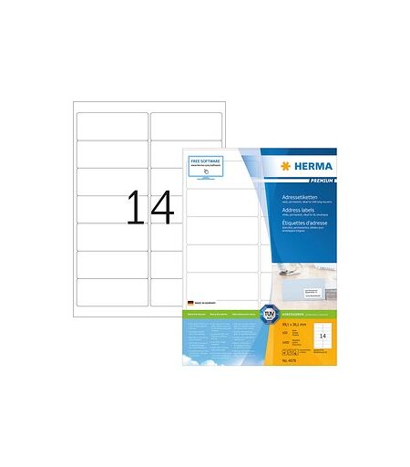 Mit den 1.400 HERMA Etiketten 4678 weiß 99,1 x 38,1 mm drucken Sie Ihre Etiketten selbstDie 1.400 HERMA Etiketten 4678 weiß 99,1 x 38,1 mm sind geeignet zum Adressieren, zum Kennzeichnen von Akten, Regalen und Behältern, zum Überkleben oder als Textaufkleber für Muster, Fotos usw.Kleben von alleinHier entscheiden Sie sich für ein Produkt aus Papier. Die matte Oberfläche ist ideal, um Informationen klar und gut lesbar zu präsentieren, ohne störende Lichtreflexionen. Das Aufkleben funktioniert ganz unkompliziert, die 1.400 HERMA Etiketten 4678 weiß 99,1 x 38,1 mm sind nämlich selbstklebend.Zum Bedrucken geeignetBesonders praktisch sind Exemplare, die Sie einfach selbst bedrucken können. Das macht die Nutzung flexibel, unkompliziert und noch vielseitiger. Benutzen Sie für den Druck folgende Geräte: Kopierer, SW-Laser, InkJet. Die Exemplare sind auf einem A4-Bogen angeordnet.Sie benötigen Nachschub?Eine Packung beinhaltet insgesamt 1400 Etiketten, verteilt auf 14 Stück je Blatt. Die Maße liegen bei 99,1 x 38,1 mm (BxH).Inklusive Rand rundumDas Design muss genauso passen wie die Funktionalität: Die weiße Farbe ist besonders praktisch, wenn Sie völlig frei in der Gestaltung sein wollen. Neutral und somit für alle Ihre Anwendungen optimal geeignet. Die Umrandung sorgt für eine klare Abgrenzung für Ihre Inhalte und Informationen.Werfen Sie einen Blick auf die Zertifizierung!Die Entscheidung für ein Produkt wie dieses, das eine Zertifizierung besitzt, bietet Ihnen als Verbraucher die Möglichkeit, einen verantwortungsvollen Umgang mit Ressourcen zu unterstützen. Sie erhalten ein Produkt mit folgendem Zertifikat: FSC®: Mit dem Kauf dieses FSC®-zertifizierten Produkts tragen Sie dazu bei, die Wälder dieser Welt zu bewahren. Der FSC® hilft Wälder zu erhalten und schützt die Interessen der Menschen und Tiere, die in bzw. von diesen Wäldern leben.Ihre Produkte verdienen nur das Beste!Sie können die 1.400 HERMA Etiketten 4678 weiß 99,1 x 38,1 mm unkompliziert in unserem Online-Shop bestellen.Etiketten online kostenlos gestalten, dazu hier Herma EtikettenAssistent öffnen ...
