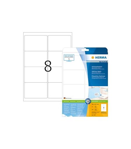 Für Ihre Adresse – die 200 HERMA Adressetiketten 5077 weiß 99,1 x 67,7 mm – für Ihre persönliche AdressierungDie wichtigsten Eigenschaften der 200 HERMA Adressetiketten 5077 weiß 99,1 x 67,7 mm auf einen Blick:Farbe: WeißMenge: 200 EtikettenBedruckbarVerfügt über einen Rand rundumDas Design muss genauso passen wie die Funktionalität: Benötigen Sie Gestaltungsspielraum und eine Kennzeichnung, die einen professionellen und neutralen Eindruck hinterlässt? Dann sollten Sie sich für eine weiße Etikettierung wie diese hier entscheiden. Die Umrandung sorgt für eine klare Abgrenzung für Ihre Inhalte und Informationen.200 Etiketten in den Maßen 99,1 x 67,7 mm (BxH)Hier können Sie Ihren Vorrat wieder auffüllen, denn Sie erhalten insgesamt 200 Etiketten, auf jedem Blatt 8 Stück. 99,1 x 67,7 mm (BxH) betragen die Maße.Können problemlos bedruckt werdenDie 200 HERMA Adressetiketten 5077 weiß 99,1 x 67,7 mm sind optimal geeignet für Kopierer, SW-Laser, InkJet. Damit das Bedrucken besonders einfach fällt, sind die Exemplare auf einem A4-Bogen angeordnet.Einfacher Druck von PortoNutzen Sie die 200 HERMA Adressetiketten 5077 weiß 99,1 x 67,7 mm auch mit dem Online-Service INTERNETMARKE. Sie können ganz komfortabel Ihr Porto ausdrucken und auf Briefe, Päckchen oder Pakete aufkleben.Besteht aus PapierHier erhalten Sie ein Produkt aus Papier. Die matte Oberfläche sorgt für ein angenehmes, nicht spiegelndes Finish, das Ihre Produkte stilvoll präsentiert. Die 200 HERMA Adressetiketten 5077 weiß 99,1 x 67,7 mm sind selbstklebend. Somit gelingt das Anbringen problemlos und ohne zusätzlichen Klebstoff.Werfen Sie einen Blick auf die Zertifizierung!Dieses Produkt besitzt aufgrund seines vorbildlichen Herstellungsprozesses, bei dem auf einen verantwortungsvollen Umgang mit Ressourcen geachtet wurde, folgendes Zertifikat: PEFC: Mit dem PEFC-Siegel ausgezeichnete Produkte wurden bei der Herstellung auf die Einhaltung ökologischer, ökonomischer sowie sozialer Standards bei der Waldbewirtschaftung geprüft.Mit diesen Besonderheiten punktet das ProduktDas machen die 200 HERMA Adressetiketten 5077 weiß 99,1 x 67,7 mm besonders: Permanent haftend. Perfekt für alle Laser- und Inkjetdrucker, Kopierer, Farblaserdrucker und Farbkopierer. Garantiert staufrei und high-speed-fähig durch extra starken Spezialverbund, Top-Planlage und Rundum-Sicherheitskante. Problemloser Druckerdurchlauf für Laserdrucker und Inkjetdrucker. Hoher Weißgrad und gleichmäßige Oberfläche für beste Druckergebnisse in Schwarz und Farbe. Spürbar dicker: extra starke Etiketten - einfaches Aufkleben. Besonders schnell und sicher haftend, auch auf kühlen und feuchten Oberflächen..Erzielen Sie beste Ergebnisse!Bestellen können Sie die 200 HERMA Adressetiketten 5077 weiß 99,1 x 67,7 mm ganz bequem hier bei uns im Online-Shop!Etiketten online kostenlos gestalten, dazu hier Herma EtikettenAssistent öffnen ...