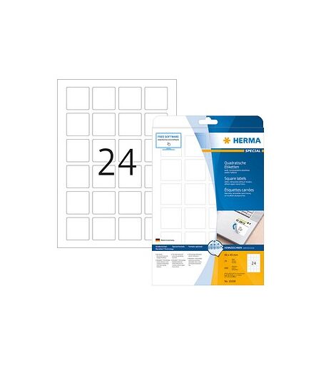 Drucken Sie Ihre Etiketten selbst – mit den 600 HERMA Etiketten 10108 weiß 40,0 x 40,0 mmErste Informationen zu den 600 HERMA Etiketten 10108 weiß 40,0 x 40,0 mm erhalten Sie hier:Farbe: WeißMenge: 600 EtikettenBedruckbarAblösbarBesteht aus PapierHier erhalten Sie einen Artikel aus Papier. Dank der matten Oberfläche ist dieser Artikel reflektionsarm und unempfindlich gegenüber Fingerabdrücken. Das Aufkleben stellt kein Problem dar, hierfür sind die 600 HERMA Etiketten 10108 weiß 40,0 x 40,0 mm nämlich selbstklebend. Sie benötigen keine Etikettierung mehr oder müssen diese neu positionieren? Dann können Sie die 600 HERMA Etiketten 10108 weiß 40,0 x 40,0 mm ganz einfach wieder vom Untergrund lösen.Angeordnet auf A4-BogenMöchten Sie Ihre Exemplare selbst bedrucken? Das ist problemlos möglich. Nutzen Sie hierfür folgende Geräte: Kopierer, SW-Laser, InkJet. Angeordnet sind die Exemplare auf einem A4-Bogen.600 Etiketten in den Maßen 40,0 x 40,0 mm (BxH)Sie erhalten in dieser Packung 600 Etiketten, verteilt auf 24 Stück je Blatt. 40,0 x 40,0 mm (BxH) betragen die Maße.Inklusive Rand rundumMachen Sie den Design-Check: Die weiße Farbe eignet sich optimal für eine neutrale Etikettierung. Das neutrale Erscheinungsbild wirkt immer professionell und kann somit für die unterschiedlichsten Zwecke genutzt werden. Die präzise Umrandung sorgt dafür, dass die Informationen sich abheben und klar strukturiert sind.Was den Artikel so speziell machtFolgende besonderen Features besitzt der Artikel: Sicher haftend auf allen glatten, trockenen, unbeschädigten und staubfreien Flächen, rückstandsfrei wieder abziehbar ohne den Untergrund zu beschädigen, problemlos repositionierbar und mehrfach wieder haftend. Ideal zur flexiblen Beschriftung, für zeitlich befristete oder wechselnde Kennzeichnungen und Oberflächen, die nicht beschädigt werden sollen..Zertifiziert und für gut befunden!Ein vorbildlicher Umgang mit Ressourcen im Rahmen der Produktherstellung ist das ausschlaggebende Kriterium für folgende Zertifizierung: FSC®: Der Forest Stewardship Council (FSC®) ist eine weltweit agierende gemeinnützige Organisation, die sich zum Ziel gesetzt hat, verantwortungsbewusste Forstwirtschaft auf der Grundlage festgelegter Prinzipien zu fördern.Steigern Sie die Wiedererkennung Ihrer Produkte!Bestellen Sie die 600 HERMA Etiketten 10108 weiß 40,0 x 40,0 mm unkompliziert hier in unserem Online-Shop!Etiketten online kostenlos gestalten, dazu hier Herma EtikettenAssistent öffnen ...