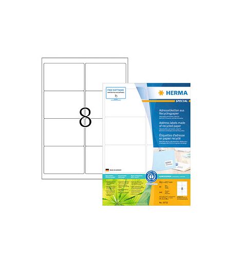 Nach Ihren Wünschen universell einsetzbar – die 640 HERMA Etiketten weiß 99,1 x 67,7 mmErste Informationen zu den 640 HERMA Etiketten weiß 99,1 x 67,7 mm gibt es hier:Farbe: WeißMenge: 640 EtikettenBedruckbarRecycling-ProduktExemplare in WeißMachen Sie den Design-Check: Die weiße Farbe eignet sich optimal für eine neutrale Etikettierung. Das neutrale Erscheinungsbild wirkt immer professionell und kann somit für die unterschiedlichsten Zwecke genutzt werden. Die Umrandung fördert eine bessere Handhabung und Positionierung.Anzahl und Format der 640 HERMA Etiketten weiß 99,1 x 67,7 mmDamit Sie sich so schnell nicht Gedanken über Nachschub machen müssen, erhalten Sie in dieser Packung 640 Etiketten, auf jedem Blatt 8 Stück. Das passende Format ist ein ausschlaggebendes Kaufkriterium und muss zu Ihrem Verwendungszweck passen. 99,1 x 67,7 mm (BxH) betragen die Maße.Praktische Anordnung zum BedruckenFür eine schöne und individuelle Gestaltung können Sie die Exemplare bedrucken. Hierfür können Sie folgende Geräte: Kopierer, SW-Laser, InkJet nutzen. Angeordnet sind die Exemplare auf einem A4-Bogen.Einfacher Druck von PortoSuper praktisch: der Druck von Internetmarken. Sie können Ihr Porto ganz bequem von zuhause auf die 640 HERMA Etiketten weiß 99,1 x 67,7 mm drucken. Bei Wunsch können Sie sogar ein passendes Motiv auswählen. Drucken, aufkleben und los.Kein Klebstoff nötigWelche umweltfreundlichen Vorteile stecken in dem recycelten Produkt? Wird aus wiederverwertetem (recyceltem) Altpapier, Pappe oder Karton hergestelltSchonung der HolzreservenGeringerer Energie- und Wasserverbrauch im Vergleich zur konventionellen HerstellungDank der matten Oberfläche ist dieser Artikel reflektionsarm und unempfindlich gegenüber Fingerabdrücken. Die 640 HERMA Etiketten weiß 99,1 x 67,7 mm sind selbstklebend. Somit gelingt das Anbringen spielend einfach und Sie sparen wertvolle Zeit.Zertifizierte Qualität!Ein verantwortungsvoller Umgang mit Ressourcen im Rahmen der Produktherstellung ist der maßgebliche Faktor für folgende Zertifizierung: Blauer Engel: Papiere, die mit dem Blauen Engel UZ 14a ausgezeichnet sind, wurden aus 100% Altpapier hergestellt. Bei der Herstellung sind der Einsatz von Chlor, halogenierten Bleichmitteln und biologisch schwer abbaubaren Komplexbildnern verboten.Bereit für die perfekte Etikettenlösung?Sie können die 640 HERMA Etiketten weiß 99,1 x 67,7 mm unkompliziert in unserem Online-Shop bestellen.Etiketten online kostenlos gestalten, dazu hier Herma EtikettenAssistent öffnen ...