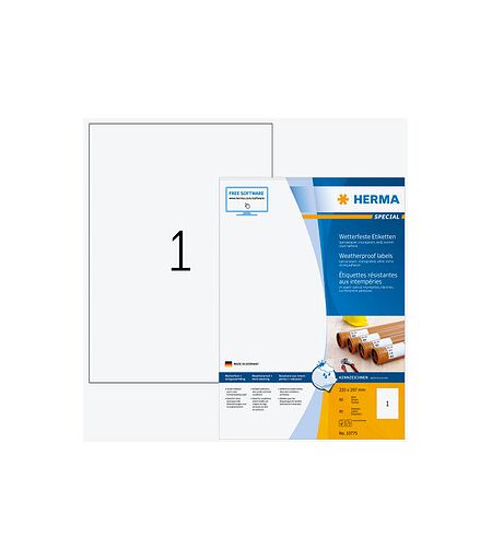 Drucken Sie Ihre Etiketten selbst – mit den 80 HERMA wetterfesten Etiketten weiß 210,0 x 297,0 mmDie 80 HERMA wetterfeste Etiketten weiß 210,0 x 297,0 mm sind wetterfest und somit insbesondere für den Außenbereich geeignet. Ideal auch für die Produktion, Lager, in Feuchträumen.Exemplare in WeißDas Design muss genauso passen wie die Funktionalität: Die weiße Farbe eignet sich optimal für eine neutrale Etikettierung. Das neutrale Erscheinungsbild wirkt immer professionell und kann somit für die unterschiedlichsten Zwecke genutzt werden.Sorgen Sie für NachschubSie erhalten in dieser Packung 80 Etiketten, welche auf 1 Stück je Blatt verteilt sind. Sie suchen das passende Format für Ihre Anforderungen? Die Maße betragen: 210,0 x 297,0 mm (BxH). Dies entspricht einem A4-Format.Womit können die 80 HERMA wetterfeste Etiketten weiß 210,0 x 297,0 mm bedruckt werden?Damit Sie flexibel in der Anwendung sind und jederzeit ein passendes Exemplar zur Verfügung haben, sind die 80 HERMA wetterfeste Etiketten weiß 210,0 x 297,0 mm bedruckbar. Hierfür können Sie folgende Geräte: Kopierer, SW-Laser nutzen. Angeordnet sind die Exemplare auf einem A4-Bogen.Verschiedenste Eigenschaften machen dieses Produkt aus – Sie haben die WahlDamit noch immer nicht genug, denn auch über diese Eigenschaften verfügt der Artikel:Temperaturbeständigkeit von -30° C bis +80° CLösungsmittelfreiSelbstklebend und praktischHier entscheiden Sie sich für Exemplare aus Papier. Hier erhalten Sie ein mattes Produkt. Hierdurch spiegelt die Etikettierung nicht und ist unempfindlicher gegenüber unschönen Fingerabdrücken. Dank Abziehhilfe müssen Sie sich nicht länger mit schwer abzuziehenden Exemplaren herumschlagen. Die einzelnen Aufkleber können spielend leicht vom Druckbogen entfernt werden. So sparen Sie Zeit und Nerven. Abziehen und aufkleben – so einfach ist es!Was ist besonders an diesem Produkt?Sie suchen nach besonderen Features? Das steckt in den 80 HERMA wetterfesten Etiketten weiß 210,0 x 297,0 mm: Öl- und Schmutz abweisend, UV- und alterungsbeständigt, abwaschbar, seewasserbeständig.Bereit für die perfekte Etikettenlösung?Bestellen können Sie die 80 HERMA wetterfesten Etiketten weiß 210,0 x 297,0 mm ganz einfach hier bei uns im Online-Shop!Etiketten online kostenlos gestalten, dazu hier Herma EtikettenAssistent öffnen ...