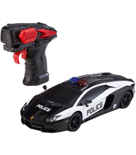 Der RC Lamborghini Aventador Police von Revell ist bereit für spannende Verfolgungsjagden! Dieses ferngesteuerte Fahrzeug mit vielen Details des großen Lamborghini-Originals und im stilvollen Polizei-Design zieht beim Fahren alle Blicke auf sich. Das liegt am Tempo von bis zu 10 km/h, das der Modell-Lamborghini dank seines starken Elektromotors erreicht. Ein weitere Blickfang ist die LED-Frontbeleuchtung, die Einsätze auch im Dunkeln ermöglicht. Die griffigen Reifen sorgen dabei für reichlich Haftung. Mit der 2,4 GHz-Fernbedienung lässt sich das Fahrzeug präzise und bis zu einer Entfernung von 30 Metern steuern. Dabei sind die Bedienelemente sowohl von Links- als auch von Rechtshändern nutzbar. ...