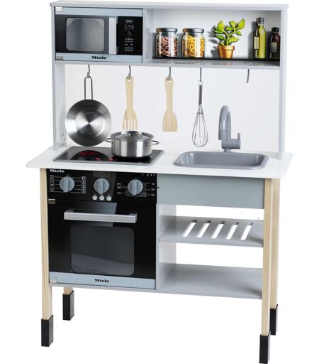 Die Miele Spielküche aus Holz ist mit einem Herd, einem Backofen, einer Mikrowelle und einer Spüle ausgestattet. Die leuchtende Herdplatte und die Geräusche sorgen für noch mehr Spielspaß. ...