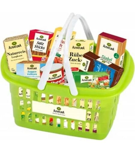 Alnatura Einkaufskorb, gefuellt Hergestellt aus Biokunststoff Schachteln hergestellt aus Recyclingmaterial Verpackungsmaterial hergestellt mit mind. 25% Recyclinganteil - Masse des Einkaufskorbes (L x B x H): 27 x 18 x 13,5 cm - Praktischer Tragegriff - Zubehoer des Einkaufskorbes: 15 Schachteln, 3 Dosen - Geeignet fuer Kinder ab 2 Jahren - Made in Germany ...