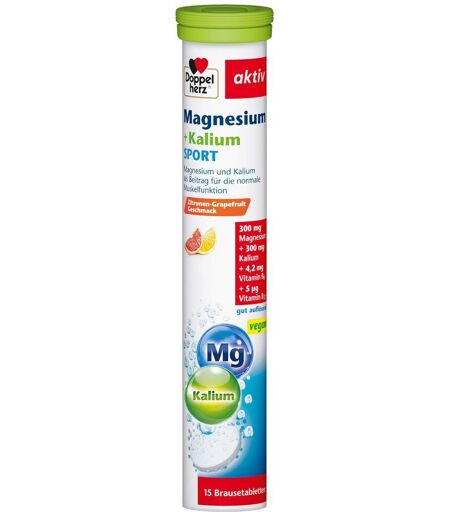 Nahrungsergänzungsmittel sind kein Ersatz für eine ausgewogene und abwechslungsreiche Ernährung und eine gesunde Lebensweise.Doppelherz® aktiv Magnesium + Kalium Sport Brausetabletten 300 mg Magnesium + 300 mg Kalium zur Unterstützung der normalen Funktion der Muskeln und des Nervensystems Magnesium als Beitrag für den normalen Energiestoffwechsel und das Elektrolytgleichgewicht Gut auflösende Brausetablette mit leckerem Zitrone-Grapefruit-Geschmack Eine optimale Versorgung mit Mineralstoffen und Vitaminen ist eine wichtige Voraussetzung für Gesundheit und Leistungsfähigkeit. Magnesium und Kalium arbeiten in zahlreichen Stoffwechselvorgängen im Körper zusammen. Für eine gute Kaliumverwertung der Zellen ist zudem auch eine ausreichende Magnesiumversorgung notwendig.Nahrungsergänzungsmittel mit SüßungsmittelnBrausetabletten mit Magnesium, Kalium und B-VitaminenZutaten:Säuerungsmittel Citronensäure, Magnesiumcarbonat, Kaliumbicarbonat, Säureregulatoren Natriumhydrogencarbonat und Natriumcarbonat, Stärke, Trennmittel Tricalciumphosphat, Süßungsmittel Natriumcyclamat und Natriumsaccharin, Aroma, Pyridoxinhydrochlorid, Farbstoff Riboflavin-5'-Phosphat, Cyanocobalamin Zusammensetzung pro Tagesportion (= 1 Brausetablette) % NRV*Magnesium300 mg80 %Kalium300 mg 15 %Vitamin B64,2 mg 300 %Vitamin B125,0 μg200 %* Nährstoffbezugswerte gemäß EU-Verordnung 1169/2011Verzehrsempfehlung: Eine Tablette täglich in einem Glas Wasser (200 ml) aufgelöst trinken.Hinweis:Die angegebene empfohlene tägliche Verzehrsmenge darf nicht überschritten werden. Nahrungsergänzungsmittel sind kein Ersatz für eine ausgewogene und abwechslungsreiche Ernährung und gesunde Lebensweise. Für kleine Kinder unzugänglich aufbewahren.Nicht für Kinder unter 12 Jahren geeignet.Personen mit Nieren- oder Herzerkrankungen sollten vor der Einnahme von Kalium Rücksprache mit ihrem Arzt halten.Mengen über 250 mg Magnesium können bei empfindlichen Personen abführend wirken.Aufbewahrung:Bei Raumtemperatur trocken lagern. Außerhalb der Reichweite von kleinen Kindern aufbewahren.Nettofüllmenge:15 Tabletten = 99 gHerstellerdaten:Queisser Pharma GmbH & Co. KGSchleswiger Str. 7424941 Flensburg ...