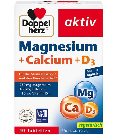 Anwendungsgebiet von Doppelherz Magnesium + Calcium + D3 TablettenDoppelherz Magnesium + Calcium + D3 Tabletten unterstützen den Knochenaufbau und die Muskelfunktion.Wirkungsweise von Doppelherz Magnesium + Calcium + D3 TablettenDieses Kombinationspräparat versorgt den Knochen mit ausreichend Calcium, um Festigkeit und Belastung zu ermöglichen. Für den Calciumeinbau in den Knochen sorgt Vitamin D. Da der Calciumstoffwechsel eine hohe Aktivität aufweist und Calcium ständig aus dem Knochen herausgelöst und wieder eingebaut werden muss, ist es wichtig auf eine ausreichende Zufuhr zu achten. Auch für die Muskelfunktion und eine leistungsfähige Signalübertragung zwischen den Nervenzellen wird Calcium benötigt. Magnesium leistet einen wichtigen Beitrag zum Energiestoffwechsel.Wirkstoffe / Inhaltsstoffe / ZutatenDoppelherz Magnesium + Calcium + D3 Tabletten enthält: