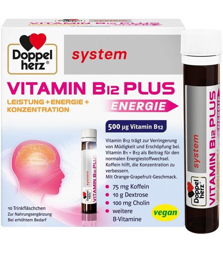 Doppelherz Vitamin B12 Plus system Trinkampullen enthält 10 g Dextrose, 500 μg Vitamin B12, 75 mg Koffein, 100 mg Cholin, Vitamin B1 und Pantothensäure. Die aufeinander abgestimmten Nährstoffe sind im praktischen Trinkfläschchen enthalten – sofort trinkfertig mit leckerem Orange-Grapefruit-Geschmack – ideal für unterwegs.