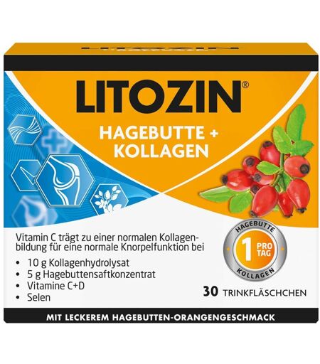 Anwendungsgebiet von Litozin Hagebutte+Kollagen TrinkfläschchenÜbergewicht und zunehmendes Alter sind belastende Faktoren. Für die Gesundheit unseres Bewegungsapparats spielt neben ausreichender, schonender Bewegung auch eine gesunde Ernährung eine Rolle. Litozin Hagebutte+Kollagen Trinkfläschchen enthält Vitamin D, Vitamin C, das Spurenelement Selen sowie zusätzlich 5 g Hagebuttensaftkonzentrat und 10 g Kollagenhydrolysat. Kollagen macht den Hauptanteil der meisten Binde- und Stützgewebe aus und bestimmt deren Eigenschaften. Kollagen ist zudem ein Faserbestandteil von Knochen, Knorpel und Sehnen. Vitamin C trägt zur normalen Kollagenbildung für eine normale Knorpel- und Knochenfunktion bei. Das Hagebuttensaftkonzentrat bildet die pflanzliche Basis des Nahrungsergänzungsmittels und wird aus reifen Hagebutten hergestellt. Als Hagebutten bezeichnet man die reifen roten Sammelnussfrüchte der Hundsrose (Rosa canina L.). Die süß-sauren Früchte sind bekannt für die darin enthaltene Vielzahl von Pflanzeninhaltsstoffen. Die in dem Nahrungsergänzungsmittel enthaltenen Vitamin C und das Spurenelement Selen tragen dazu bei, die Zellen vor oxidativem Stress zu schützen. Vitamin D spielt für den Erhalt normaler Knochen und der normalen Muskelfunktion eine Rolle. Auch unterstützt es die normale Funktion des Immunsystems. Die aufeinander abgestimmten Nährstoffe sind im praktischen Trinkfläschchen enthalten – sofort trinkfertig mit fruchtigem Hagebutten-Orangengeschmack – ideal für unterwegs.
