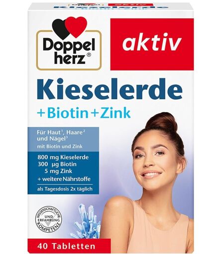 Anwendungsgebiet von Doppelherz Kieselerde + Biotin + Zink TablettenDoppelherz Kieselerde + Biotin + Zink Tabletten ist ein Nahrungsergänzungsmittel für gesunde Haut, kräftiges Haar, feste Nägel und ein straffes Bindegewebe. Doppelherz Kieselerde + Biotin + Zink Tabletten setzt dabei auf eine Kombination von natürlicher Kieselerde und Mineralstoffen, die eine ausreichende Versorgung mit lebensnotwendigen und stoffwechselrelevanten Nährstoffen gewährleistet.Wirkungsweise von Doppelherz Kieselerde + Biotin + Zink TablettenDoppelherz Kieselerde + Biotin + Zink Tabletten enthält eine ideale Mineralstoffkombination: