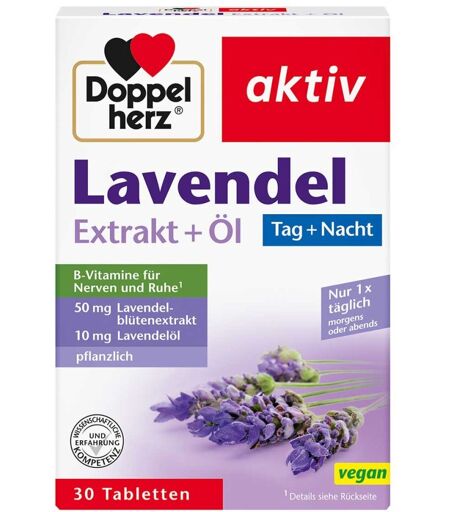 Anwendungsgebiet von Doppelherz Lavendel Extrakt+öl TablettenDoppelherz Lavendel Extrakt+öl Tabletten ist ein Nahrungsergänzungsmittel. Berufliche Herausforderungen und familiäre Verpflichtungen, persönlicher Erfolgs- und Zeitdruck sind heute allzu oft Bestandteil unseres Alltags. Regelmäßige Bewegung und erholsamer Schlaf helfen uns dabei im hektischen Alltag gelassen zu bleiben. Auch eine ausgewogene und gesunde Ernährung kann hierzu einen Beitrag leisten. Dazu gehören auch B- Vitamine, die vielseitige Funktionen im Körper haben. So tragen Vita min B12 und B6 zu einer normalen psychischen Funktion und einer normalen Funktion des Nervensystems bei.