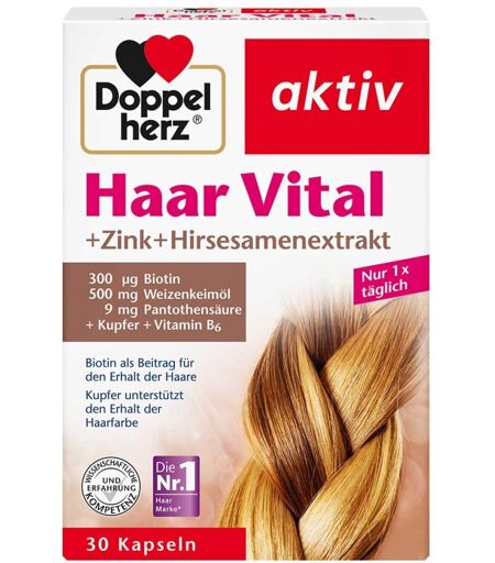 Anwendungsgebiet von Doppelherz Haar Vital+zink+hirseextrakt KapselnDoppelherz Haar Vital+zink+hirseextrakt Kapseln ist ein Nahrungsergänzungsmittel für den Aufbau und das Wachstum von kräftigem und gesunden Haar. Eine ausgewogene Kombination aus wichtigen Mineralstoffen, lebensnotwendigen Vitaminen, ungesättigten Fettsäuren und Spurenelementen vitalisiert die Haarstruktur und leistet einen entscheidenden Beitrag für den Aufbau von Haarsubstanz.Wirkungsweise von Doppelherz Haar Vital+zink+hirseextrakt KapselnDoppelherz Haar Vital+zink+hirseextrakt Kapseln enthält Hirse, das den Aufbau der Haarsubstanz durch wertvolle Nährstoffe unterstützt. Weitere Nährstoffe wie Zink, Biotin, Pantothensäure und Vitamin B6 gewährleisten lebensnotwendige Stoffwechsel Prozesse des Körpers und sind maßgeblich bei dem Zellaufbau und der Zellversorgung beteiligt. Der Zusatz an Vitamin C gewährleistet zusätzlich den Schutz der Zellen.Wirkstoffe / Inhaltsstoffe / ZutatenEine Kapsel von Doppelherz Haar Vital+zink+hirseextrakt Kapseln enthält: