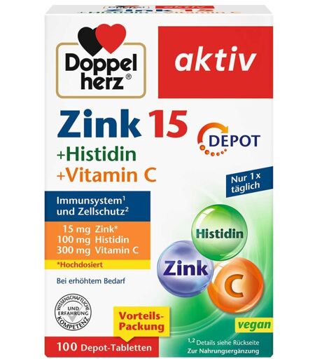 Anwendungsgebiet von Doppelherz Zink + Histidin + Vitamin C Depot TablettenDoppelherz Zink + Histidin + Vitamin C Depot Tabletten sind ein Nahrungsergänzungsmittel. Die Tabletten von Doppelherz enthalten 15 mg Zink und 300 mg Vitamin C. Zusätzlich ist die Aminosäure L-Histidin enthalten. Zink ist ein lebensnotwendiges Spurenelement, das für viele Funktionen des Körpers benötigt wird.