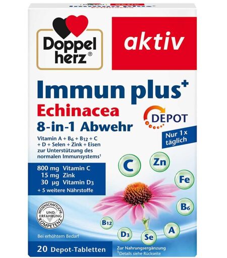 Anwendungsgebiet von Doppelherz Immun plus Echinacea Depot TablettenDoppelherz Immun plus Echinacea Depot Tabletten enthält 5 ausgesuchte Vitamine (A, C, D, B6, B12) und 3 Spurenelemente (Zink, Eisen, Selen), die einen Beitrag zu einer normalen Funktion des Immunsystems leisten. Zusätzlich enthalten sind: 25 mg Echinacea-Trockenpresssaft.