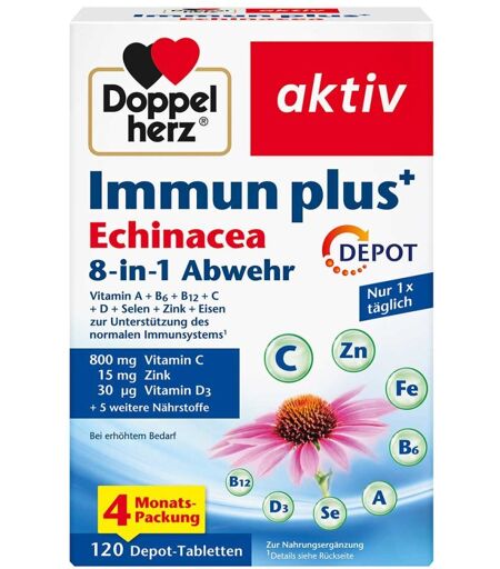 Anwendungsgebiet von Doppelherz Immun plus Echinacea Depot Tabletten Doppelherz Immun plus Echinacea Depot Tabletten ist ein Nahrungsergänzungsmittel n mit Vitaminen und Spurenelementen, Echinacea-Trockenpresssaft .Wirkstoffe / Inhaltsstoffe / ZutatenZutaten von Doppelherz Immun plus Echinacea Depot Tabletten:Vitamin C, Füllstoff Hydroxypropylmethylcellulose, Füllstoff mikrokristalline Cellulose, modifizierte Stärke, Zinksulfat, Trennmittel Speisefettsäuren, Füllstoff Dicalciumphosphat, EchinaceaTrockenpresssaft, Eisenfumarat, Trennmittel Talkum, Trennmittel Magnesiumsalze der Speisefettsäuren, Farbstoff Eisenoxide und Eisenhydroxide, Trennmittel Siliciumdioxid, Vitamin B6, Feuchthaltemittel Glycerin, Vitamin A, Natriumselenit, Vitamin D, Vitamin B12