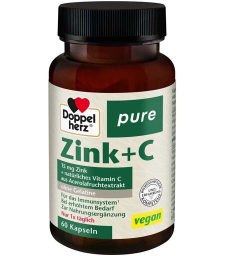 Anwendungsgebiet von Doppelherz Zink+C Pure KapselnDoppelherz Zink+C Pure Kapseln enthalten 20 mg natürliches Vitamin C aus Acerolafruchtextrakt und 15 mg Zink aus Zinkbisglycinat. Der verwendete Acerolafruchtextrakt enthält 17 % natürliches Vitamin C. Zink und Vitamin C werden dabei ausschließlich in Kapseln pflanzlichen Ursprungs verarbeitet.Zink ist ein lebensnotwendiges Spurenelement. Da es der Körper nicht selbst produzieren kann, ist eine regelmäßige Zufuhr mit der Nahrung essenziell. Bei einer ausgewogenen Ernährung ist auch hinsichtlich der Zinkversorgung die richtige Auswahl der Lebensmittel entscheidend.Wirkstoffe / Inhaltsstoffe / ZutatenZutaten von Doppelherz Zink+C Pure Kapseln Reismehl, Überzugsmittel Hydroxypropylmethylcellulose, Vitamin C-haltiger Acerolafruchtextrakt, Zinkbisglycinat, Maltodextrin, Farbstoff Calciumcarbonat