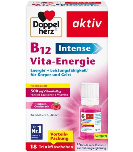 Anwendungsgebiet von Doppelherz B12 Intense Vita-Energie - TrinkampullenDoppelherz B12 Intense Vita-Energie - Trinkampullen enthalten 500 μg hochdosiertes Vitamin B12 in Kombination mit drei ausgesuchten B-Vitaminen und den Eiweißbausteinen L-Glutamin und L-Serin. Für Energie und Leistungsfähigkeit spielt eine ausreichende Versorgung mit Nährstoffen eine wichtige Rolle. Vitamin B12 + Vitamin B6 + Niacin tragen bei zu einem normalen Energiestoffwechsel, zu einer normalen Funktion des Nervensystems sowie zur Verringerung von Müdigkeit und Erschöpfung bei.