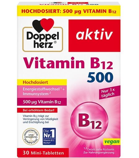 Anwendungsgebiet von Doppelherz Vitamin B12 500 TablettenDoppelherz Vitamin B12 500 Tabletten enthalten 500 μg Vitamin B12 und unterstützen daher auch bei einem erhöhten Bedarf sowie bei einer unausgewogenen Ernährung die gute Vitamin B12-Versorgung. Für Gesundheit, Energie und Leistungsfähigkeit spielt eine ausreichende Versorgung mit Nährstoffen eine wichtige Rolle. Hierzu gehört auch das Vitamin B12. Eine sehr gute Vitamin B12-Quelle stellen tierische Lebensmittel dar. Lebensmittel pflanzlicher Herkunft enthalten normalerweise nur geringe Mengen an Vitamin B12. Vitamin B12 trägt zu einem normalen Energiestoffwechsel, zur Verringerung von Müdigkeit und Erschöpfung sowie zur normalen psychischen Funktion bei. Darüber hinaus leistet Vitamin B12 einen Beitrag zu einer normalen Funktion des Nervensystems und zu einer normalen Bildung der roten Blutkörperchen. Vitamin B12 unterstützt zudem eine normale Funktion des Immunsystems.