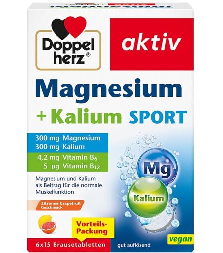 Anwendungsgebiet von Doppelherz Magnesium+kalium Sport BrausetablettenIn Doppelherz Magnesium+kalium Sport Brausetabletten sind 300 mg Magnesium, 300 mg Kalium sowie die B-Vitamine B6 mit 4,2 mg und B12 mit 5 µg sinnvoll kombiniert. Besonders in Zeiten körperlicher Beanspruchung braucht der Körper zur Erhaltung seiner Leistungsfähigkeit ausreichend Nährstoffe. Magnesium und Kalium sind an zahlreichen Stoffwechselvorgängen im Körper beteiligt. Magnesium leistet einen Beitrag zum normalen Energiestoffwechsel und zur normalen Muskelfunktion. Der Mineralstoff unterstützt die normale Funktion des Nervensystems und trägt zum Elektrolytgleichgewicht bei. Kalium trägt zur normalen Funktion des Nervensystems und der Muskeln bei und leistet einen Beitrag zur Aufrechterhaltung eines normalen Blutdrucks. Vitamin B6 trägt zur normalen Bildung der roten Blutkörperchen bei und spielt eine Rolle für den normalen Eiweißstoffwechsel. Vitamin B12 leistet einen Beitrag zur normalen Bildung der roten Blutkörperchen.