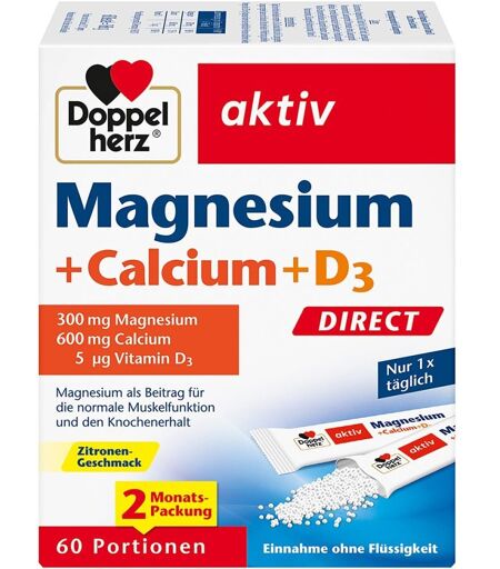Anwendungsgebiet von Doppelherz Magnesium+Calcium+D3 Direct PelletsDoppelherz Magnesium+Calcium+D3 Direct Pellets versorgt Sie nicht nur mit wichtigen Nährstoffen, die einen Beitrag für die normale Muskelfunktion und den Knochenerhalt leisten, sondern schmeckt auch ausgezeichnet!Eine optimale Versorgung mit Mineralstoffen und Vitaminen ist eine wichtige Voraussetzung für Gesundheit und Leistungsfähigkeit. Magnesium und Calcium sind zwei lebensnotwendige Mineralstoffe, die unser Körper für die Aktivierung und Erhaltung zahlreicher biologischer Prozesse im Körper benötigt.Wirkstoffe / Inhaltsstoffe / ZutatenZutaten von Doppelherz Magnesium+Calcium+D3 Direct Pellets:Calciumcarbonat, Magnesiumoxid, Füllstoff Xylit, Füllstoff Sorbit, Säureregulator Mononatriumcitrat, Säuerungsmittel Citronensäure, Aroma, Säuerungsmittel Äpfelsäure, Trennmittel Magnesiumsalze der Speisefettsäuren, Verdickungsmittel Natrium-Carboxymethylcellulose, Süßungsmittel Aspartam, Säureregulator Natriumcarbonat, Süßungsmittel Natriumcyclamat, Vitamin DGegenanzeigenBei bekannter Überempfindlichkeit gegenüber einen der oben genannten Inhaltsstoffe sollte dieses Produkt nicht angewendet werden.DosierungVerzehrempfehlung von Doppelherz Magnesium+Calcium+D3 Direct Pellets:Täglich den Inhalt eines Beutels verzehren. Die Micro-Pellets direkt auf die Zunge geben, langsam zergehen lassen und schlucken.Bitte den Beutel in Pfeilrichtung aufreißen.HinweiseNahrungsergänzungsmittel stellen keinen Ersatz für eine abwechslungsreiche Ernährung dar. Eine ausgewogene Ernährung und gesunde Lebensweise sind wichtig. Die empfohlene tägliche Verzehrmenge sollte nicht überschritten werden. Außerhalb der Reichweite von kleinen Kindern aufbewahren. Kühl und trocken lagern.Kann bei übermäßigem Verzehr abführend wirken.Doppelherz Magnesium+Calcium+D3 Direct Pellets können in Ihrer Versandapotheke www.apotheke.at erworben werden. ...