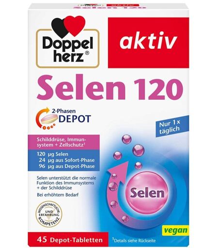Anwendungsgebiet von Doppelherz Selen 120 2-phasen Depot TablettenEine Tablette von Doppelherz Selen 120 2-phasen Depot Tabletten enthält 24 µg aus der Sofort Phase und 96 µg aus der Depot-Phase. Für das Wohlbefinden und die Gesundheit spielt eine optimale Versorgung mit Vitaminen und Spurenelementen eine wichtige Rolle. Dazu gehört auch das Spurenelement Selen, welches der Körper nicht selbst herstellen kann. Da in Europa die Böden oftmals selenarm sind (DGE,2021), tragen pflanzliche Lebensmittel häufig nur zu einem geringen Teil zur Selenzufuhr bei. Selen trägt dazu bei, die Zellen vor oxidativem Stress zu schützen und leistet einen Beitrag zur normalen Funktion des Immunsystems und der Schilddrüse.
