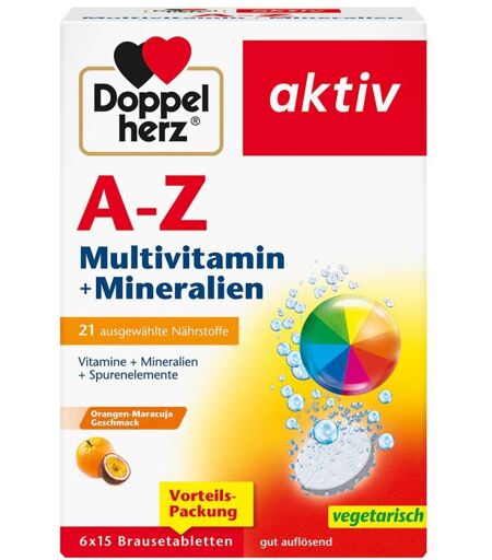 Anwendungsgebiet von Doppelherz A-z Multivitamin+mineralien Brausetabletten Doppelherz A-z Multivitamin+mineralien Brausetabletten enthalten sorgfältig aufeinander abgestimmte Vitamine, Mineralstoffe und Spurenelemente – von Vitamin A bis Zink. Eine ausreichende Versorgung mit Vitaminen und Mineralstoffen ist Voraussetzung für Gesundheit