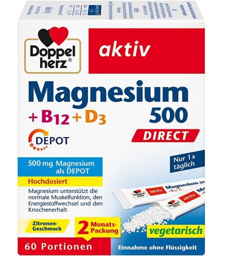 Anwendungsgebiet von Doppelherz Magnesium 500 + B12 + D3 DIRECT DEPOTDoppelherz Magnesium 500 + B12 + D3 DIRECT DEPOT unterstützt die Vitamin- und Mineralstoffversorgung mit einer Kombination aus Magnesium als DEPOT sowie Vitamin B12 + Vitamin D3.Magnesium leistet einen Beitrag zum normalen Energiestoffwechsel und zur normalen Funktion von Muskeln und des Nervensystems.Außerdem trägt der Mineralstoff zum Elektrolytausgleich bei.Vitamin B12 trägt zu einem normalen Energiestoffwechsel und zur Verringerung von Müdigkeit und Erschöpfung bei.Vitamin D trägt zum Erhalt normaler Knochen und einer normalen Muskelfunktion bei.Wirkstoffe / Inhaltsstoffe / ZutatenZutaten von Doppelherz Magnesium 500 + B12 + D3 DIRECT DEPOT:Magnesiumoxid, Füllstoff Sorbit, Säureregulator Mononatriumcitrat, Palmfett (ganz gehärtet), Füllstoff Xylit, Säuerungsmittel Citronensäure, Verdickungsmittel Natrium-Carboxymethylcellulose, Aroma, Magnesiumcitrat, Süßungsmittel Aspartam, Süßungsmittel Acesulfam-K, Trennmittel Magnesiumsalze der Speisefettsäuren, Vitamin B12, Vitamin DGegenanzeigenBei bekannter Überempfindlichkeit gegenüber einen der oben genannten Inhaltsstoffe sollte dieses Produkt nicht angewendet werden.DosierungVerzehrempfehlung von Doppelherz Magnesium 500 + B12 + D3 DIRECT DEPOT:Täglich den Inhalt eines Beutels verzehren. Die Micro-Pellets direkt auf die Zunge geben, langsam zergehen lassen und schlucken. Bitte den Beutel in Pfeilrichtung aufreißen.HinweiseNahrungsergänzungsmittel stellen keinen Ersatz für eine abwechslungsreiche Ernährung dar. Eine ausgewogene Ernährung und gesunde Lebensweise sind wichtig. Die empfohlene tägliche Verzehrmenge sollte nicht überschritten werden. Außerhalb der Reichweite von kleinen Kindern aufbewahren. Kühl und trocken lagern.Mengen über 250 mg Magnesium können bei empfindlichen Personen abführend wirken. Kann bei übermäßigem Verzehr abführend wirken. Enthält eine Phenylalaninquelle.Doppelherz Magnesium 500 + B ...