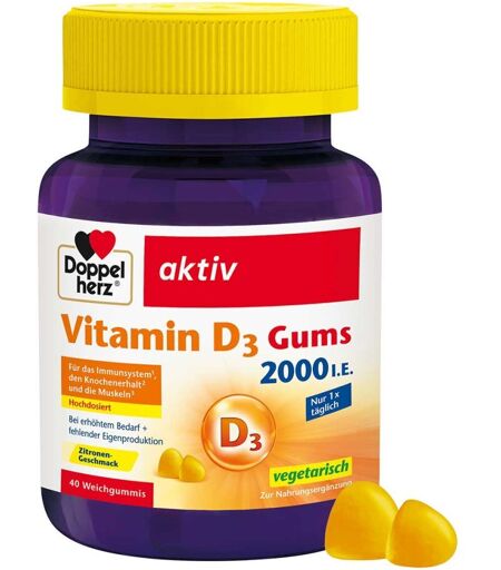 Anwendungsgebiet von Doppelherz Vitamin D3 2000 I.e.gumsDoppelherz Vitamin D3 2000 I.e.gums enthält 50 μg (= 2000 I.E.) Vitamin D pro Tagesportion (= 1 Gum). Die gluten- und lactosefreien Gums haben einen leckeren Zitronen-Geschmack und sind für eine vegetarische Enährung geeignet. Vitamin D trägt zur normalen Funktion des Immunsystems, zum Erhalt normaler Knochen und Zähne sowie zu einer normalen Verwertung von Calcium bei. Zudem leistet Vitamin D einen Beitrag zum Erhalt der normalen Muskelfunktion.