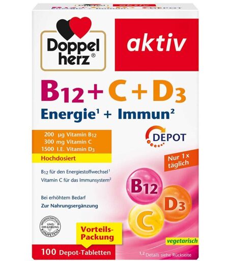 Anwendungsgebiet von Doppelherz B12+C+D3 Depot Aktiv TablettenDoppelherz B12+C+D3 Depot Aktiv Tabletten ist ein Nahrungsergänzungsmittel und enthält Vitamin B12 für den Energiestoffwechsel in Kombination mit Vitamin C und Vitamin D zur Unterstützung der normalen Funktion des Immunsystems. So kann eine gute Vitaminversorgung bei erhöhtem Bedarf, einer unausgewogenen Ernährung oder bei nachlassender Vitamin B12-Verwertung im Alter unterstützt werden. Vitamin B12 trägt zu einem normalen Energiestoffwechsel und zur Verringerung von Müdigkeit und Erschöpfung bei. Zudem leistet es einen Beitrag zu einer normalen Funktion des Nervensystems und trägt zur normalen psychischen Funktion sowie zu einer normalen Bildung roter Blutkörperchen bei. Durch die Depot-Funktion werden die Nährstoffe über mehrere Stunden nach und nach freigegeben und dem Körper so anhaltend zur Verfügung gestellt.