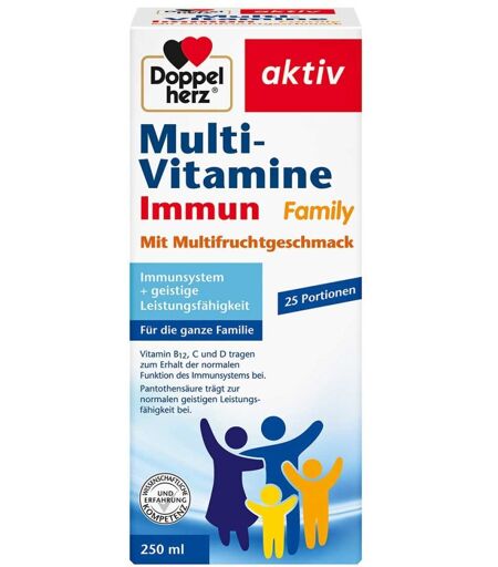 Eine gesunde, abwechslungsreiche und ausgewogene Ernährung ist für die ganze Familie wichtig. Täglich wird über die Nahrung eine Vielzahl an unterschiedlichen Nährstoffen aufgenommen, die für zahlreiche Funktionen im Körper wichtig sind. Bei einseitiger, unausgewogener Ernährung oder in speziellen Lebenssituationen, wie z. B. bei anhaltend hoher körperlicher und geistiger Belastung oder in der nasskalten Jahreszeit, kann der Bedarf an Nährstoffen erhöht sein. Daher sollten Erwachsene bei sich selbst, aber auch bei ihren Kindern, auf einen ausgewogenen und gesunden Speiseplan achten. Doppelherz aktiv Mult-Vitamine Immun Family liefert wichtige Vitamine und zusätzlich den Mineralstoff Magnesium sofort trinkfertig mit leckerem Multifruchtgeschmack. Der tägliche Verzehr von Doppelherz aktiv Multi-Vitamine Immun Family versorgt die ganze Familie mit wertvollen Nährstoffen und leistet so einen Beitrag für Gesundheit und Wohlbefinden. Vitamin C und D tragen zu einer normalen Funktion des Immunsystems bei. Vitamin B12 und Folsäure leisten einen Beitrag zur Verringerung von Müdigkeit und Ermüdung. Pantothensäure trägt zur normalen geistigen Leistungsfähigkeit bei. Biotin, Vitamin B1, B2 und B6 leisten einen Beitrag für die normale Funktion des Nervensystems. Vitamin B1, B2, B6, B12 und Magnesium tragen zum normalen Energiestoffwechsel bei. Vitamin A leistet einen Beitrag zum Erhalt der normalen Sehkraft. Vitamin C und E tragen zum Schutz der Zellen vor oxidativem Stress bei und Magnesium sowie Vitamin D tragen zum Erhalt normaler Knochen bei.