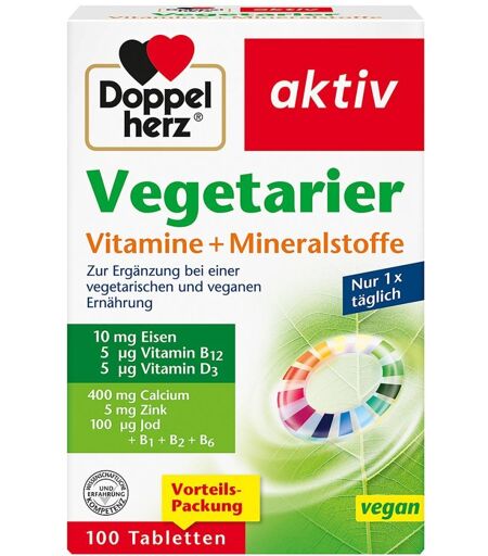 Anwendungsgebiet von Doppelherz Vegetarier Vitamine + MineralstoffeDoppelherz Vegetarier Vitamine + Mineralstoffe ist ein Nahrungsergänzungsmittel mit speziell abgestimmten Nährstoffen für die vegetarischen und veganen Lebensweise. Wirkstoffe / Inhaltsstoffe / ZutatenDoppelherz Vegetarier Vitamine + Mineralstoffe enthält: