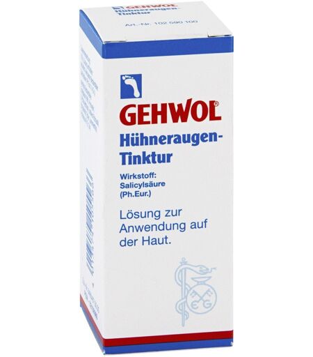Anwendungsgebiet von GEHWOL Hühneraugen-TinkturNutzen Sie GEHWOL Hühneraugen-Tinktur zur äußerlichen Anwendung gegen Hühneraugen. GEHWOL Hühneraugen-Tinktur kann mit Hilfe des beigefügten Spatels direkt auf die betroffene Stelle aufgetragen werden. Die schmerzhaften Druckstellen werden gelindert.Wirkungsweise von GEHWOL Hühneraugen-TinkturDie in GEHWOL Hühneraugen-Tinktur enthaltene Salicylsäure weicht die abgestorbene Haut, aus der Hühneraugen bestehen, auf und löst diese ab. Somit beschleunigt GEHWOL Hühneraugen-Tinktur das Abheilen der Hühneraugen.Wirkstoffe / Inhaltsstoffe / Zutaten100 g Lösung enthalten: arzneilich wirksamer Bestandteil: Salicylsäure (Ph. Eur.) 14,0 g