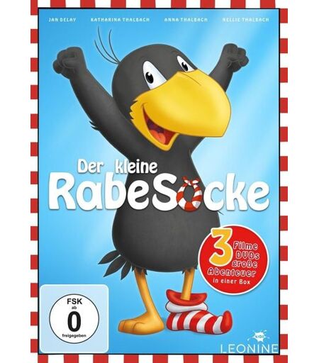 Der kleine Rabe Socke: Der kleine Rabe Socke hat eine große Klappe und allerlei Unsinn im Kopf. Aus Versehen beschädigt er den Staudamm am Waldrand, sodass der Stausee in den Wald zu laufen droht. Gemeinsam mit dem ängstlichen Schaf Wolle und dem starken Bär Eddi macht Socke sich auf den Weg zu den Bibern, die den Schaden bestimmt beheben können. Der kleine Rabe Socke 2 - Das große Rennen: Als dem frechen kleinen Raben Socke durch ein Missgeschick die gesamte Ernte der Waldtiere in den Fluss purzelt, muss ganz dringend Nachschub her, bevor Frau Dachs etwas merkt! Das Geld für neue Wintervorräte will Socke beim großen Rennen durch den Wald gewinnen. Der kleine Rabe Socke - Suche nach dem verlorenen Schatz: Socke ist zum Dachbodenaufräumen verdonnert worden, wobei er eine waschechte Schatzkarte findet! Um den verschollenen Schatz rankt sich eine geheimnisvolle Legende: Wer es schafft, bis zu ihm vorzudringen, der wird König des Waldes! Zusammen mit seinen Freunden bricht Socke auf, um den Schatz zu finden! ...