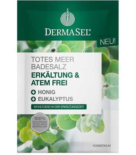 Anwendungsgebiet von Dermasel Totes Meer Badesalz Erkältung & AtemfreiBefreiendes Erkältungsbad – Tief durchatmen & entspannen mit Dermasel Totes Meer Badesalz Erkältung & AtemfreiGerade in der Erkältungszeit kann das Durchatmen schwerfallen. Ein wohltuendes Vollbad mit Totes Meer Salz, duftendem ätherischem Eukalyptus-Öl und echtem Honig ist dann genau das Richtige. Die bewährten Wirkstoffe aus der Natur wirken spürbar lösend, wärmen den Körper und helfen, die Atemwege zu befreien. Perfekt für eine entspannende Erholung und ein rundum wohltuendes Gefühl!Wirkstoffe / Inhaltsstoffe / ZutatenDermasel Totes Meer Badesalz Erkältung & Atemfrei enthält:Maris Sal (Dead Sea Salt), Maris Sal, Parfum, Eukalyptus Globulus Leaf Oil, Cinnamomum Camphora Leaf Oil, Camphor, Carthamus Tinctorius Seed Oil, Disodium Lauryl Sulfosuccinate, Honey, Propylene Glycol, Tocopherol, CI 19140, CI 42090, Limonene, Citral, Citronellol, Linalool.GegenanzeigenBei bekannter Überempfindlichkeit gegenüber einem der oben genannten Inhaltsstoffe sollte das Produkt nicht angewendet werden.DosierungAnwendungsempfehlung von Dermasel Totes Meer Badesalz Erkältung & Atemfrei:Zunächst den geschlossenen Beutel gut schütteln, anschließend öffnen und den gesamten Beutelinhalt in das einlaufende, warme Badewassergeben und gut vermischen. Empfohlene Badedauer: ca. 15 Minuten.HinweiseVorsicht: Durch die enthaltenen Öle können die Badewanne und umliegende Bereiche rutschig werden! Badewanne bitte nach der Anwendung ordentlich mit heißem Wasser ausspülen und Produktrückstände gründlich entfernen.Bei Fieber, Herz-/Kreislaufschwäche sollten Sie, wie bei jedem Bad, vor der Anwendung Ihren Arzt oder Apotheker befragen! Nur äußerlich anwenden und für Kinder unzugänglich aufbewahren.Kühl und trocken lagern. Nicht mit empfindlichen Gegenständen in Kontakt bringen.Dermasel Totes Meer Badesalz Erkältung & Atemfrei können in Ihrer Versandapotheke www.apotheke.at erworben werden. ...