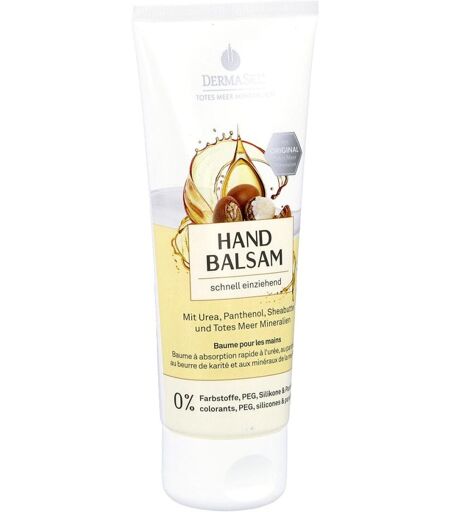 Anwendungsgebiet von Dermasel Totes Meer HandbalsamDermasel Totes Meer Handbalsam ist ein Handbalsam mit ORIGINAL Totes Meer Mineralien, um Ihre Hände zu verwöhnen. Zudem verfügt es über besonders reichhaltige und natürliche Öle der Sonnenblume, Avocado und Sheabutter. Wirkungsweise von Dermasel Totes Meer HandbalsamDas zusätzlich in Dermasel Totes Meer Handbalsam enthaltene Panthenol sowie Urea spenden der Haut Feuchtigkeit und verleihen der Haut ein geschmeidiges, gepflegtes Gefühl. Genießen Sie den Duft von Milch und Honig inklusive einer warmen Arganölnote auf der zart gepflegten Haut.Wirkstoffe / Inhaltsstoffe / ZutatenDermasel Totes Meer Handbalsam enthält: