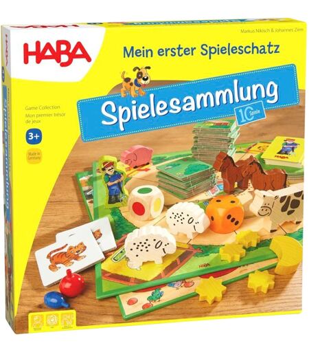 Die große HABA-Spielesammlung Mein erster Spieleschatz bringt die schönsten Spielschätze zusammen! Mein erster Spieleschatz ab 3 Jahren mit 34 Holzteilen und 10 Spielen tolle Memo-, Lauf- und Farbspiele für 2 - 6 Spieler Wer hilft Bauer Bert am besten? Wer kauft die leckersten Früchte auf dem Markt? Und wer weiß, wo sich die frechen Tiere auf der Weide versteckt haben? 10 Spielideen mit einfachen Regeln und kurzer Spieldauer ermöglichen einen gelungenen Einstieg in die Welt der Spiele. Altbewährte Spieleklassiker sind kindgerecht umgestaltet und vereinfacht worden. Sodass schon die Jüngsten Spaß am Spielen haben. Bei klassischen, kooperativen und spannenden Brett-, Memo- und Kartenspielen vergeht die Zeit wie im Flug. ...