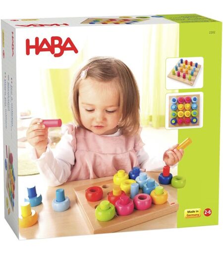 Das HABA-Steckspiel Farbkringel bietet unendlichen Spielspaß mit einer einfachen Idee: Auf eine Steckplatte aus stabilem Buchenholz lassen sich 16 farbenfrohe Stecker und ebenso viele farbige Ringe setzen. Die vielfältigen Kombinationen und Muster, die sich aus den acht Farben ergeben, regen die Fantasie an. Kreative Stapelkünstler bauen die Ringe sogar in die Höhe. Mit den Steckern und Ringen lernen die Kinder spielerisch, Farben zu erkennen und zuzuordnen und trainieren sowohl die Auge-Hand-Koordination als auch die Feinmotorik. Auch das Zählen lernen kleine Farbenfreunde mit dem Steckspiel Farbkringel: Wie viele blaue Ringe gibt es und wie viele grüne Stecker? ...